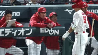7回表に野間が何とかショートの頭を越すヒットでノーノーを免れるも後続の菊池、小園、坂倉が凡退に終わる。
